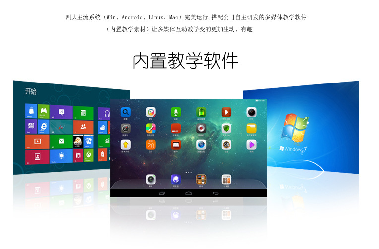 集成了電子白板、平板電視、電腦、投影機(jī)、投影幕布、音響、廣告機(jī)、WINI等多種功能為一體的互動(dòng)教學(xué)機(jī),從而增強(qiáng)了教學(xué)互動(dòng)性,使教學(xué)更簡潔、更簡易、更高效。
